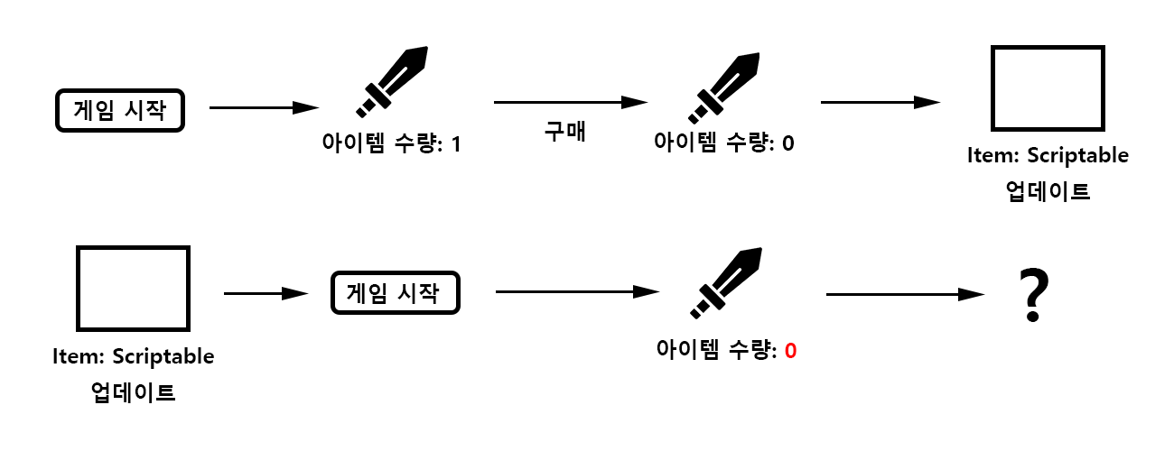 이전 코드를 보면 Item(Scriptable) 데이터를 그대로 사용해서 상품 정보를 바꾸면 Item 정보도 그대로 바꿔서 2번째 게임 실행 시 초기화가 안되는 문제가 발생하였다.