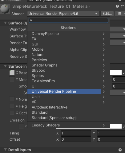 Material Inspector 창을 보면 다음과 같이 Shader에 Universal Render Pipeline이 생긴 것을 확인 할 수 있다. 저 쉐이더가 바로 URP Asset에 호환되므로 저것을 선택해서 수동으로 연결해주면 해결된다.