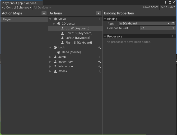 Player Action을 만들고 각각 Move, Look 등 Player가 Action 할 수 있는 것들을 만들고 Properties에서 적절한 ActionType을 고른 후 (Move의 경우 상하좌우 이동 방향을 얻기 위해 Vector2) 키를 바인딩 해준다.