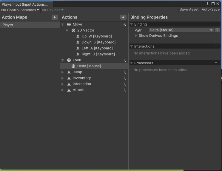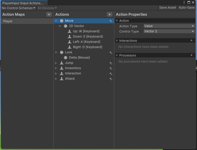 Player Action을 만들고 각각 Move, Look 등 Player가 Action 할 수 있는 것들을 만들고 Properties에서 적절한 ActionType을 고른 후 (Move의 경우 상하좌우 이동 방향을 얻기 위해 Vector2) 키를 바인딩 해준다.