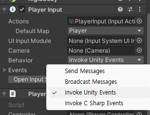 Player에 만들어 놓은 Input System을 넣었더니 Behavior를 여러가지 고를 수 있었다.