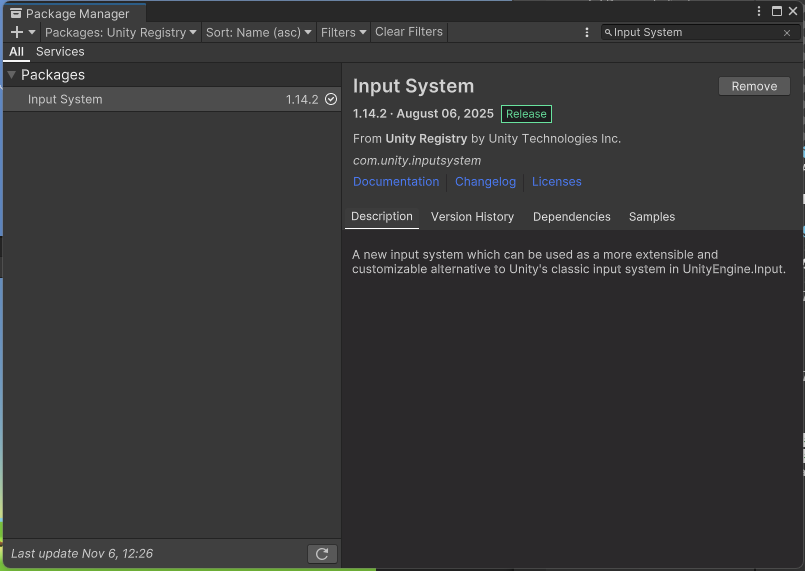 Unity Window -> Package Manager -> Registy -> Input System이라고 입력하면 Package를 설치할 수 있다.