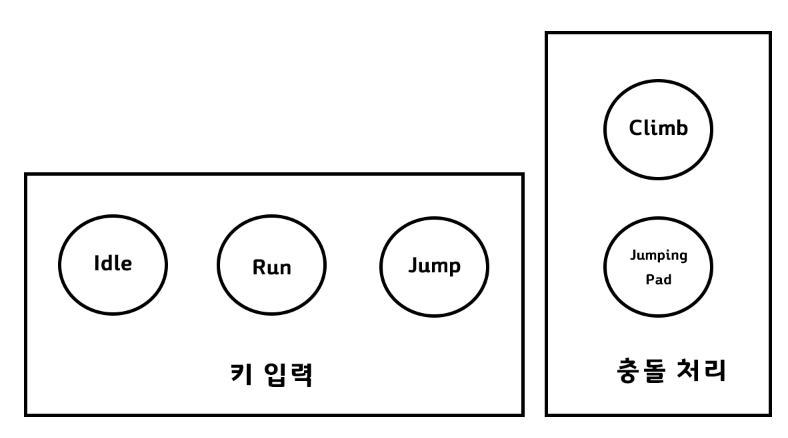 따라서 기본 5가지의 상태 (Idle, Run, Jump, JumpingPad, Climb) 모두 플레이어 움직임에 관련된 상태로 상관관계를 묶고 버프는 플레이의 Condition이나 State에 관계하기 때문에 독립적 요소라고 판단하고 State에서 배제하였다.