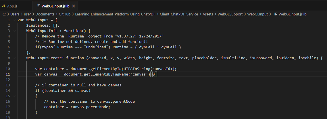 문제는 바로 WebGLInput.jslib 파일에 있었다.