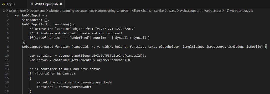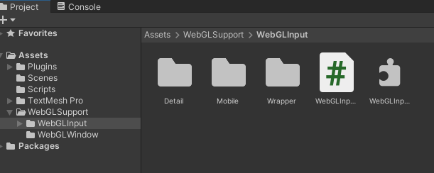 패키지를 다운받으면 여러가지 폴더가 나오는데 우리는 InputField의 한글 입력 문제를 해결하고자 하니 WebGLInput.cs 파일을 이용할 것이다.